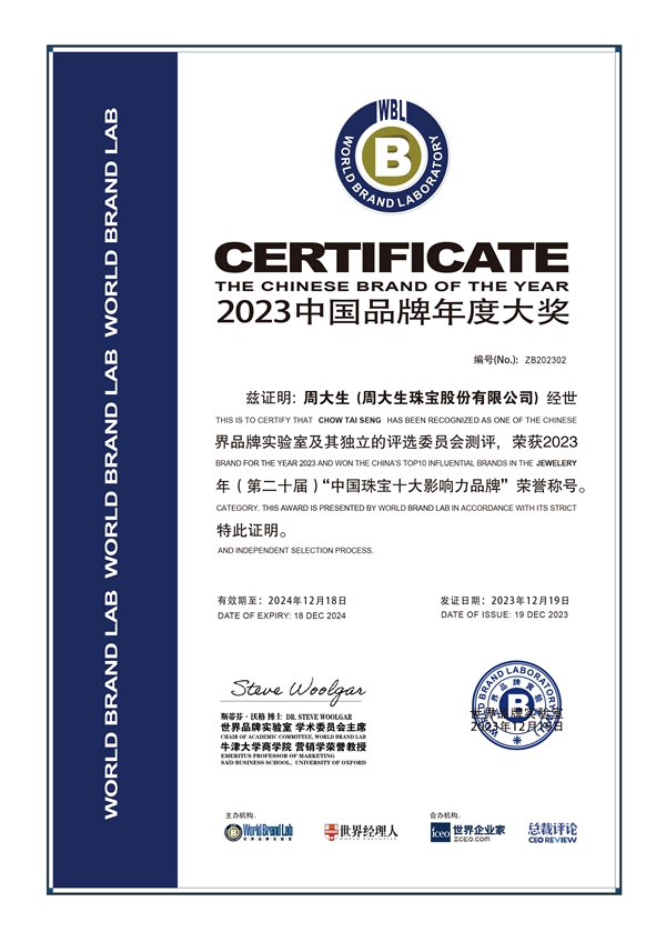 12月19日,2023年“中国品牌年度大奖”评选在“世界经理人峰会”上揭晓,这项被誉为“中国品牌奥斯卡”的年度奖项,由业界权威机构世界品牌实验室(World Brand Lab)在香港颁发。周大生珠宝经世界品牌实验室及独立的评选委员会测评,荣获“2023年中国珠宝十大影响力品牌”及“2023年文化品牌大奖”两项殊荣,这是对周大生品牌矫健发展的强力肯定,也赋予了周大生新的奋斗目标和更高的期许。