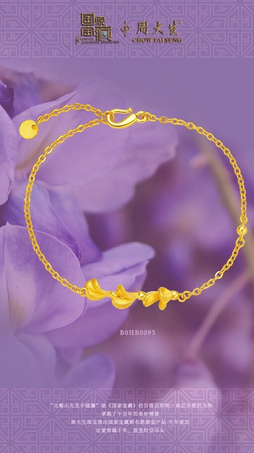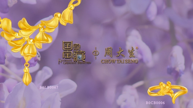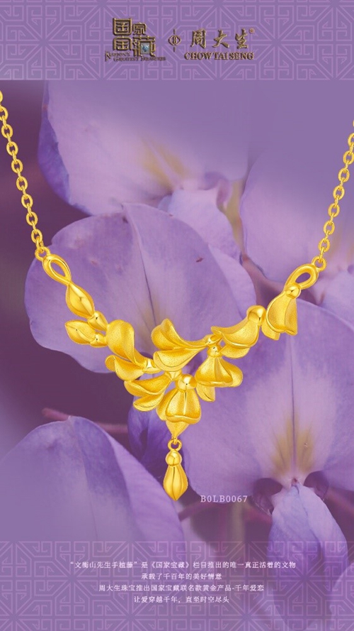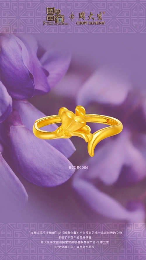 国家宝藏x周大生联名IP“千年爱恋”套系,提炼紫藤花形象,将紫藤花唯美灵动的形象展现得栩栩如生,通过压光与闪砂工艺的对比,花卉更加具有层次感,细腻耐看。历经千百年的紫藤花,以全新的样貌呈现在世人眼前,永恒的黄金将承载千年不变的爱。