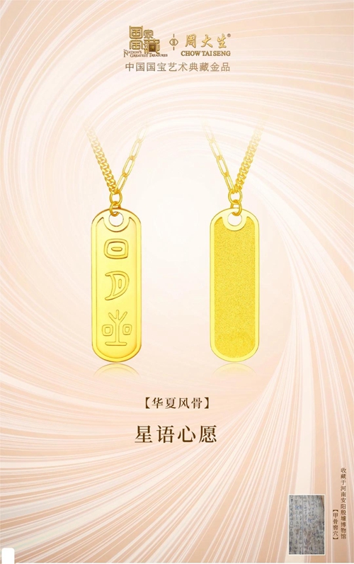 YH127 甲骨窖穴中的甲骨出自商王武丁时期,是中国最早的“皇家档案库”,记录了当时的天文、地理、农业等重大信息,历经千年风霜,但文化精髓依旧。国家宝藏×周大生联名IP“星语心愿”设计灵感源自传世国宝甲骨窖穴的千年华夏风骨,以甲骨“日月星”的文字传递“星”愿。