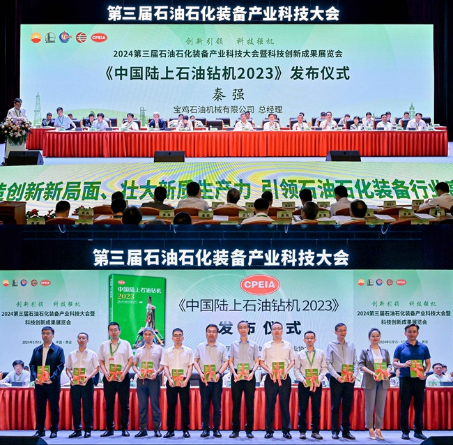 会议同期举行了《中国陆上石油钻机2023》发布和赠书仪式,宝鸡石油机械有限公司总经理秦强在发布仪式上致辞,部分参加编写单位的代表上台接收赠书。