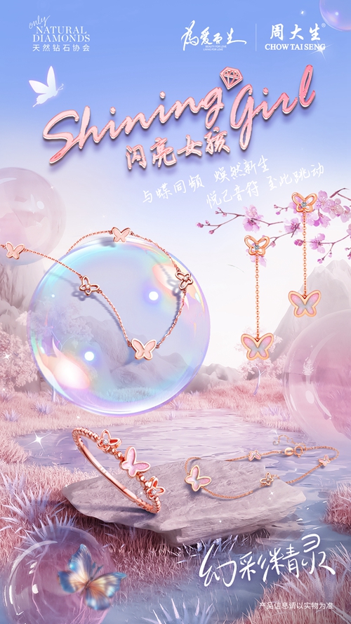 在春夏之交的美好时光,花朵以及裹挟着花香的微风沁人心脾,蝴蝶穿梭其中更增添浪漫氛围,此情此景与正值青春的活力女孩相得益彰。周大生珠宝借春夏最具代表性的花朵、蝴蝶、晨露等元素作为设计启发,为活力女孩们全新打造了Shining Girl系列新品。新潮的造型设计和创新工艺的加入让Shining Girl系列新品拥有强大的时尚基因,充分点亮春夏潮服穿搭,鼓舞正值青春的活力女孩去闯去爱去发光,以青春见证美好,点“靓”整个春夏。