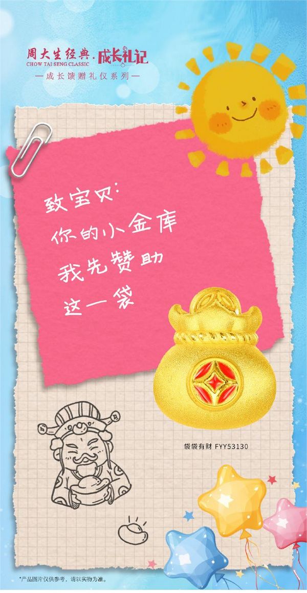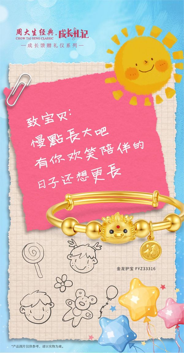 六一儿童节童心来袭,这不仅是孩子们找寻生活宝藏的一天,也是父母们找寻未泯童心的机会。借六一儿童节来临之际,周大生经典精心打造了“金色童年,福佑成长”为主题的系列活动,其甄选主推的成长礼记系列黄金产品不仅能满足小朋友的烂漫童趣,更能帮助大朋友重拾童年回忆,跨时空串联起不同世代的童年,并送上中国传统福佑文化代表的爱与祝福。