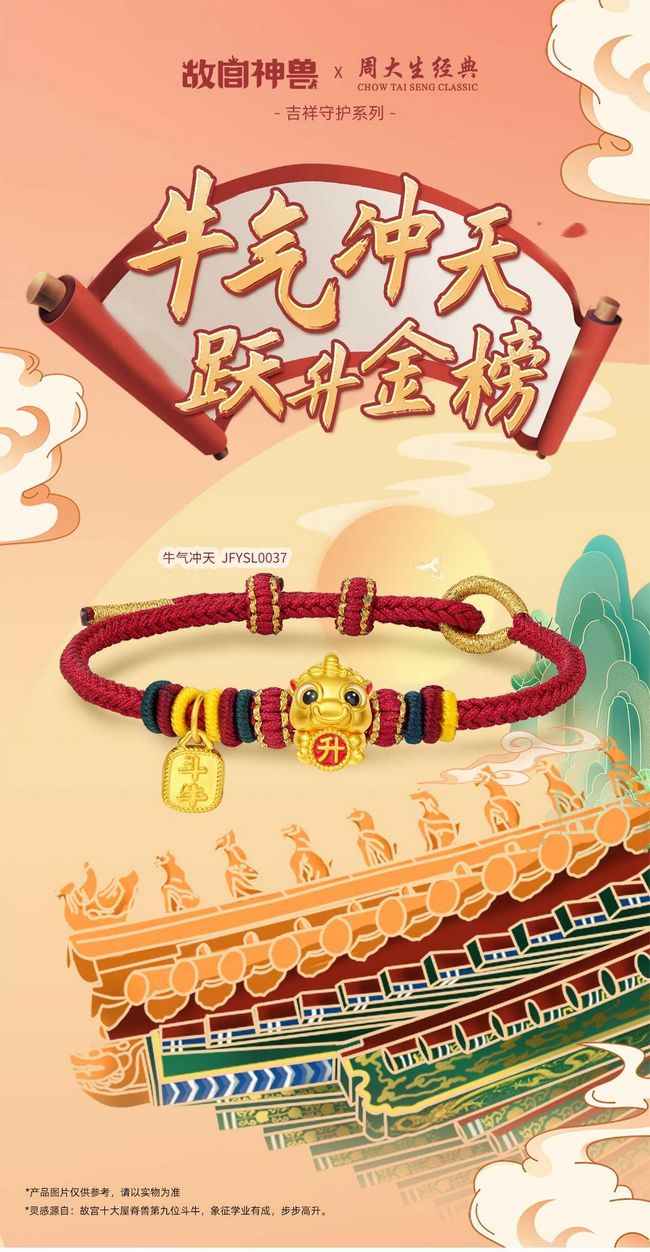 周大生经典携手“故宫神兽”IP,以守护故宫皇朝六百余年的神兽们为主角打造联名系列产品,让神兽的玄妙守护力量走进生活。故宫十大屋脊兽之一的斗牛象征着学业有成,步步高升。“牛气冲天”将斗牛神兽和高升令牌进行组合,局部运用珐琅工艺,增加产品的亮点,丰富视觉体验。整体结构圆润饱满,呈现出斗牛神兽萌趣可爱的一面,助力高考学子旗开得胜。