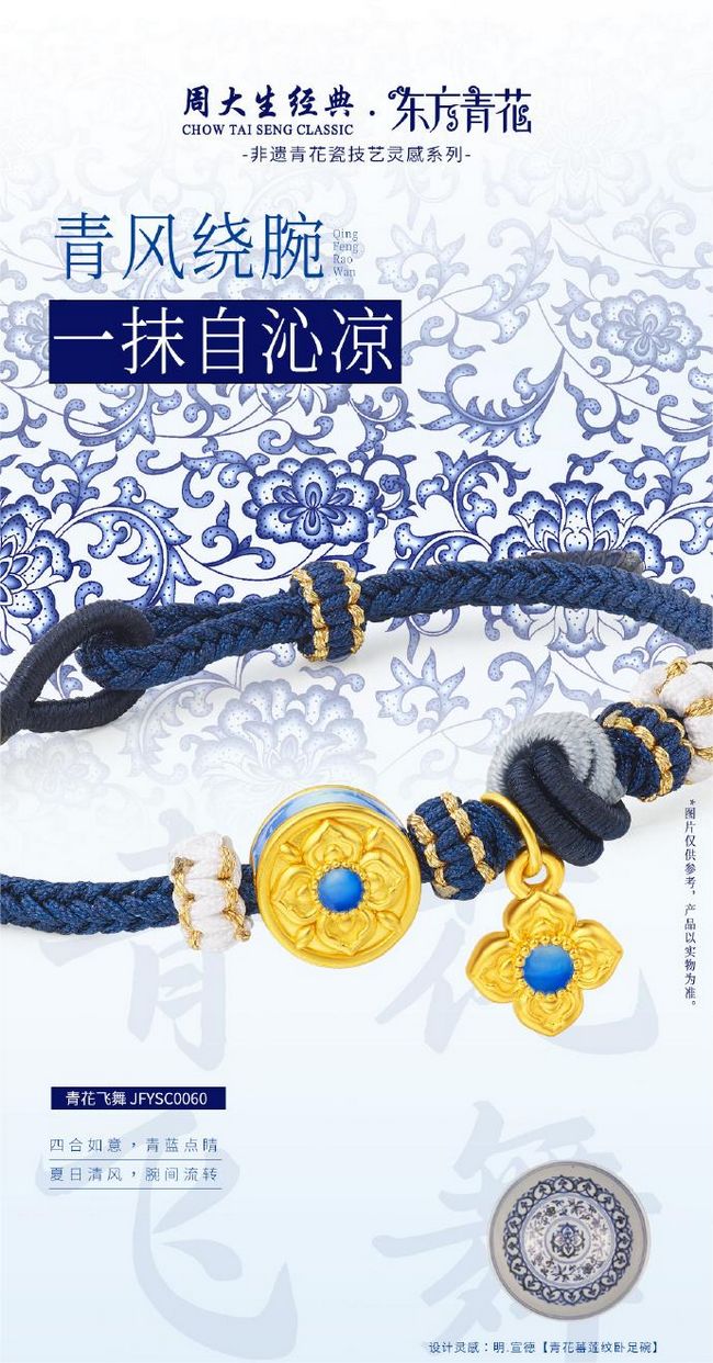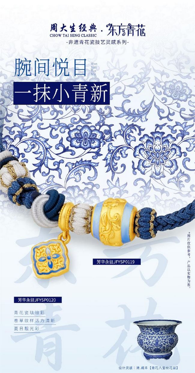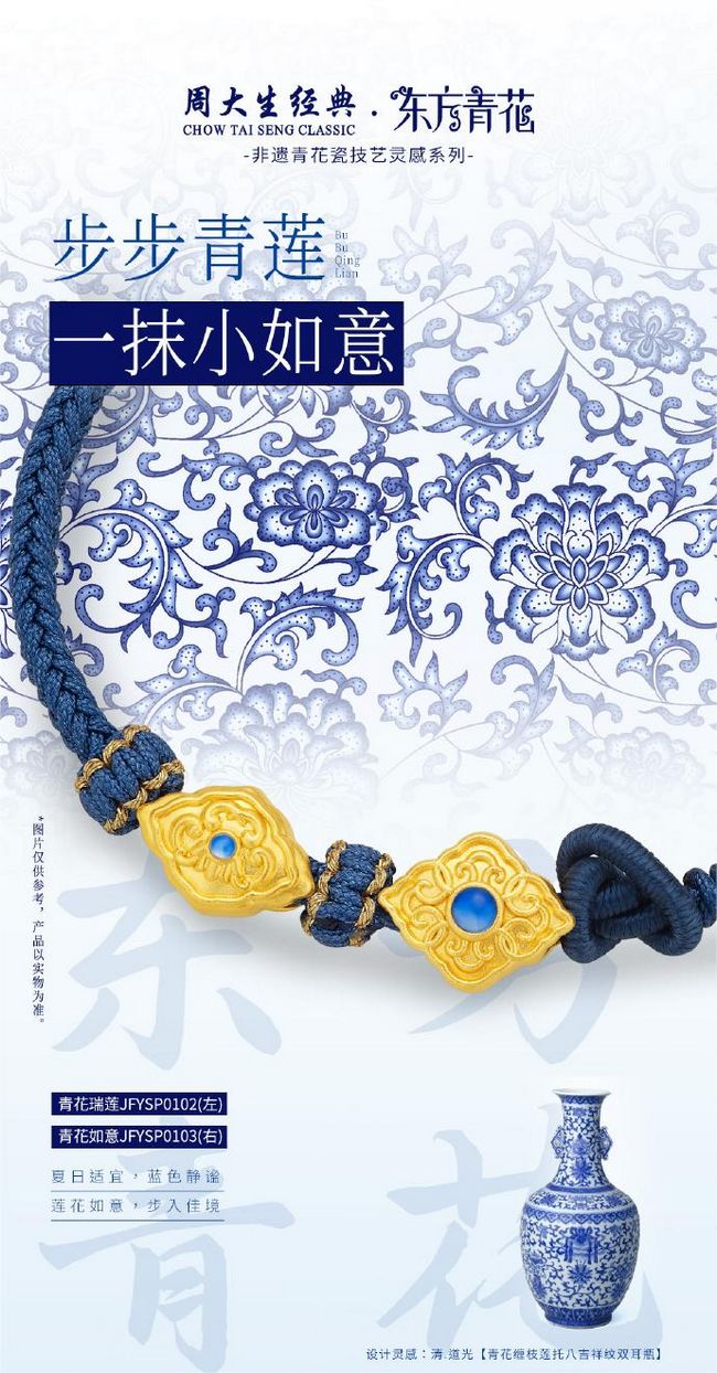 青花流转,世代流传,周大生经典东方·青花系列将青花瓷独特的清新雅致之美与黄金相融合,不仅继承了青花瓷的灵魂和精髓,更融入了现代设计的巧妙构思,打造具有东方高雅气质的珠宝首饰,这既是对中华优秀传统文化的传承与弘扬,更是东方文化珠宝品牌——周大生经典的匠心和创新。