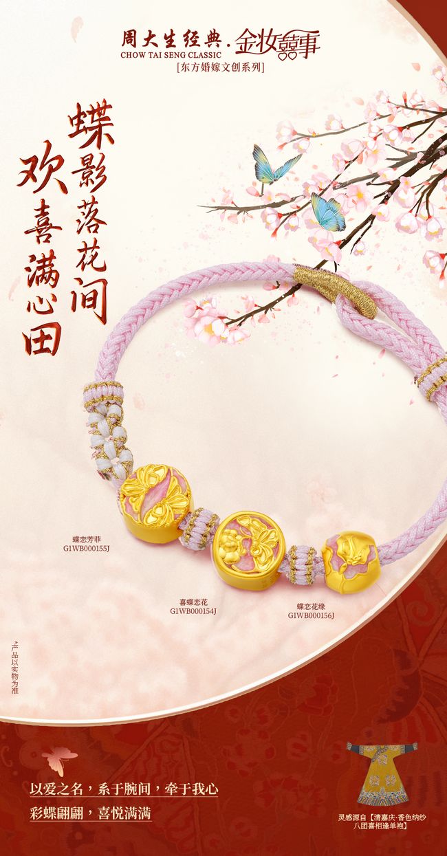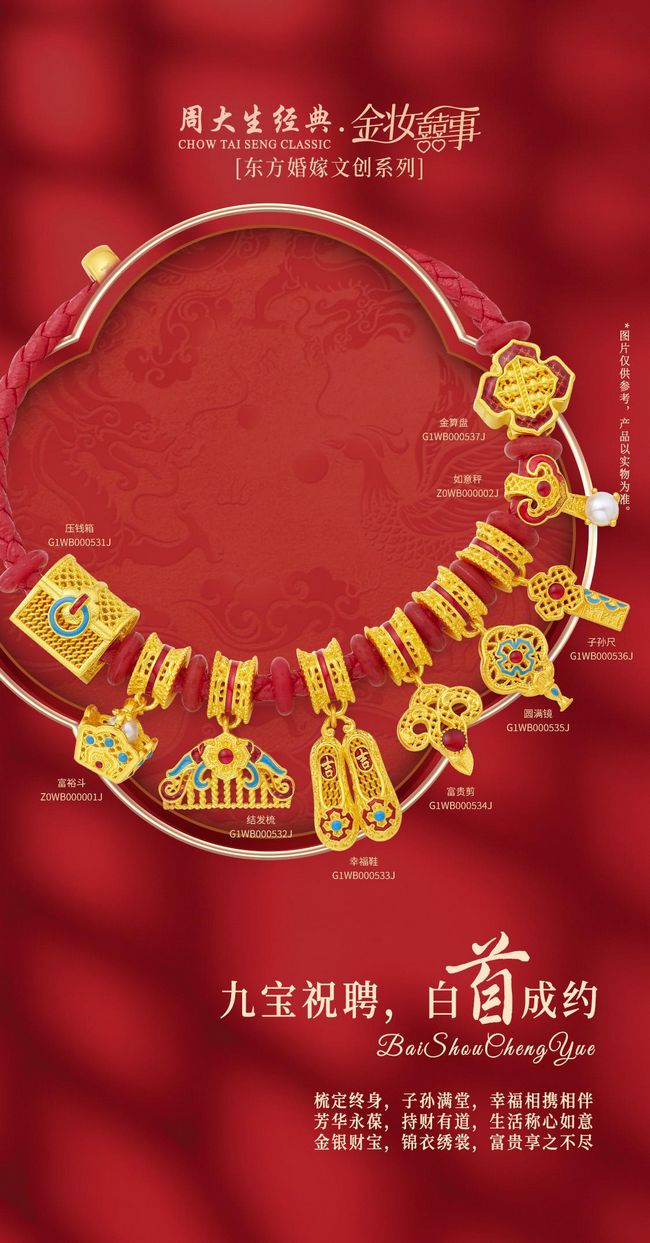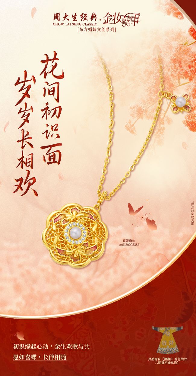 金妆囍事,皆悦于心。周大生经典·金妆囍事系列溯源中国传统婚嫁文化之根,以现代珠宝设计和工艺,再现华夏流传千年的传统仪式感和中式浪漫,为选择中式婚礼的年轻消费者带来更多惊喜和感动,愿天下有情人所得皆所愿,共同奔赴向幸福的彼岸。