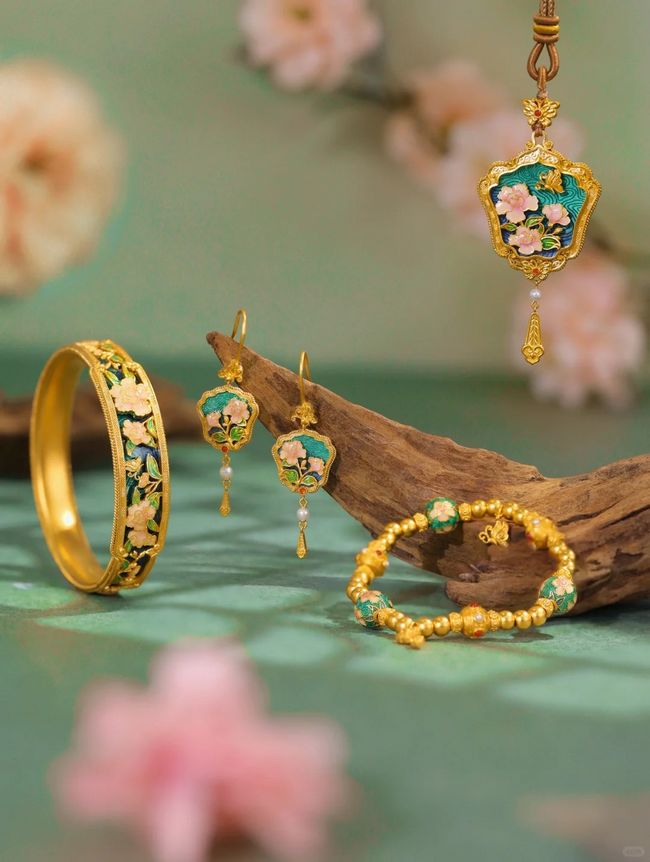 在黄金工艺的革新之路上,周大生珠宝不断推陈出新。在本次东方意象时尚盛典的现场,周大生带来了产品矩阵中极具代表性的国家宝藏联名系列“花见荣华”套系产品。该系列产品以周大生独家冠名的《国家宝藏》第四季展演文物——南宋·《百花图》卷中的阇提花元素为设计灵感,结合中式宫扇、花窗等传统元素,将富贵荣华的意象巧妙融入产品设计之中。黄金缀以宝石和珍珠,更添奢华之感,彰显了产品的精致与高贵。产品还采用了传统手工錾刻技艺,辅以细腻的工笔描金和彩色珐琅工艺,色彩层次分明,风格典雅,完美再现了宋代的美学风范,充分激活中华优秀传统文化的生命力,也让传统文化以更鲜活的方式走近大众生活。