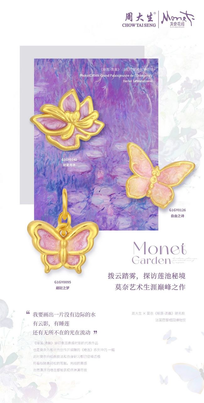 《吉维尼的艺术家花园》飞舞的蝴蝶为周大生腕美·莫奈花园系列翩跹之梦提供了设计灵感。提取蝴蝶自然的形态并缀以莫奈紫珐琅,体现了蝴蝶在花园中随风浮动自然之美,营造绮丽梦幻的氛围感,戴在腕间举手投足尽显优雅与从容。